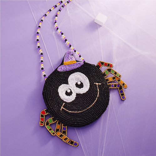 Size - 6.5' X 5.5'Strap Size - 42' LBeads On Front OnlyZipper ClosureAdorable beaded crossbody bag shaped like a smiling spider with a witch hat and colorful legs. A charming Halloween accessory perfect for trick-or-treating, costumes, or festive outfits.