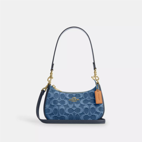 Signature denim vachetta leather and smooth leather Two credit card slots Inside snap pocket Zip-top closure fabric lining Detachable short strap with 8 3/4 drop Detachable long strap with 22 1/2 drop for shoulder or crossbody wear 7 3/4 (L) x 5 (H) x 2 1/4 (W) Exclusive of trim this denim style is crafted of cotton sourced from farms that use regenerative agricultural practicesthose that help to maintain and rejuvenate land increase biological diversity and soil health and could lead to increased carbon absorption Style No. CDQ25 | Coach Outlet Teri Crossbody Bag In Signature Denim - Blue, Size - Mini