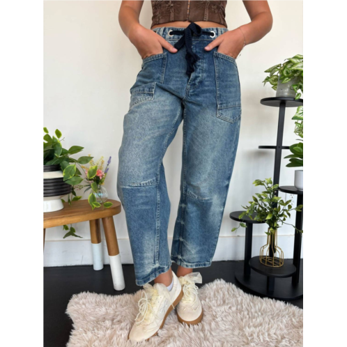 [US] Aaron & Amber eyelet waist medium wash barrel denim jeans in blue