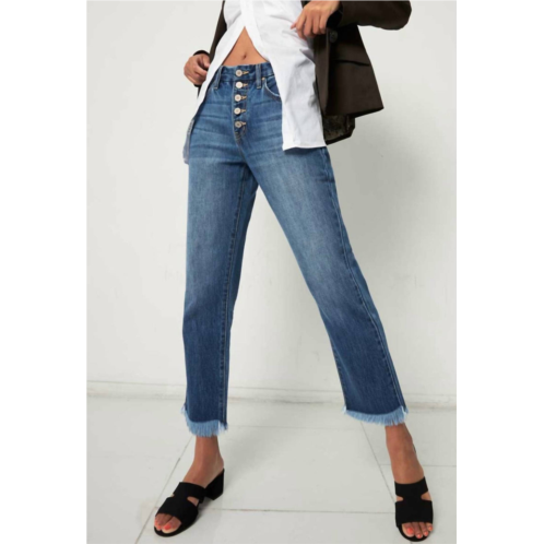 These must-have jeans are fit to perfection.Experience timeless style with KanCan's Taurus High Rise Jeans in a classic medium wash. These women's jeans feature a high-rise waist with a straight-leg fit, complete with a 10.25-inch rise and a 27-inch inseam, providing a flattering silhouette. Made from 100% cotton denim, they offer a genuine, textured feel enhanced by the slight fading and marbling effect. With a five-pocket design and gold accents, this versatile pair is finished with a five-button closure and a carefree frayed hem. Care - Machine wash.