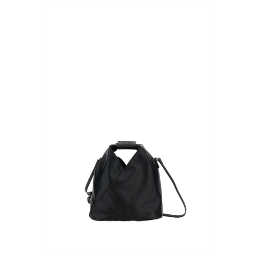 This triangular crossbody bag is made from high-quality black faux-leather, showcasing a modern design that reflects minimalist sophistication. The two-section construction allows for shape adjustment through snap buttons, demonstrating meticulous craftsmanship. A leather handle with numeric logo detailing adds a unique touch, while the smooth texture is enhanced by iconic white stitching on the back. An internal pocket with a button closure provides practicality, paired with an elegant black label featuring a white logo. - Brand - MM6 By Maison Margiela - Product Type - Shoulder Bag - Materials - Faux-leather fabric, Leather
