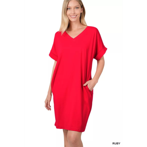 This Brushed Dty Rolled Short Sleeve V-Neck Dress is a versatile and comfortable piece for your wardrobe. The brushed Dty fabric offers a soft and cozy feel against the skin. The rolled short sleeves and V-neckline add a casual and stylish touch to the dress. Pair it with sneakers for a relaxed daytime look or dress it up with heels for a more polished ensemble. Transition effortlessly from day to night in this effortless and chic V-neck dress.