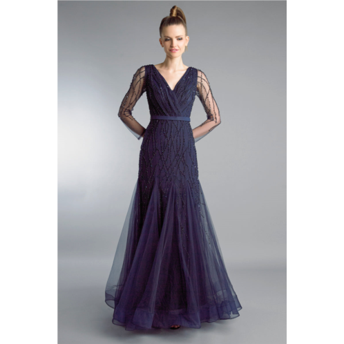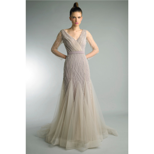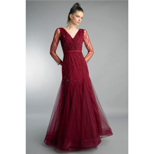 A line beaded gown approx. length - 63'l from shoulder to hem; 75'l down center back.v neckline and back.long, sheer sleeves.banded waist.a-line silhouette.floor-length hem.back zipper.polyester.imported.