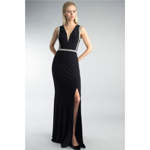 Style: gownSleeve Length: sleevelessHem: split hemOccasion: eveningNeckline: v neck