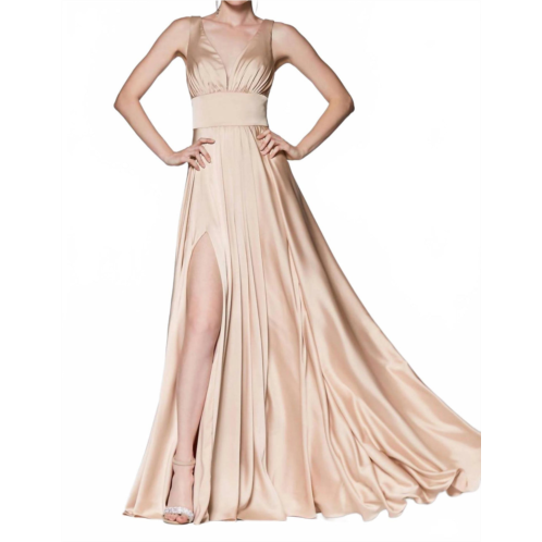 [US] Cinderella Divine satin v-neck dress with slit in nude