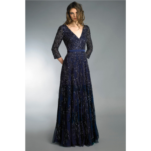 Long sleeve beaded gown with v neck