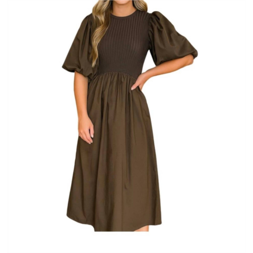 The perfect length dress does exist.Discover the Kenzie Midi Dress by Sophie the Label, a perfect choice for your spring events. This solid brown A-line dress features short puffed sleeves and a crewneck for a chic and comfortable fit. With no closure type, it offers an easy slip-on style. Care instructions - machine washable for effortless maintenance.