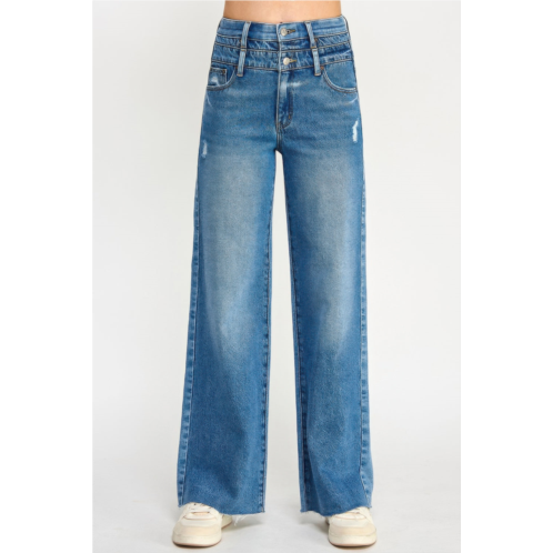 These high-rise double waist wide leg jeans combine structure with bold, modern style. Featuring a unique double waistband, they enhance the waistline while creating a layered, fashion-forward look. The wide-leg cut elongates the silhouette, and stretch-infused fabric ensures comfort throughout the day. With classic five-pocket styling and a zip fly, these jeans balance trend-forward design with everyday wearability.