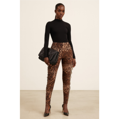 Bring bold energy to your wardrobe with these Leopard Side Ruffle Printed Pants. This high-rise silhouette features an allover animal-inspired print blending leopard and marble textures for a striking visual effect. Lightweight mesh fabric provides breathable comfort, while cascading ruffle trim along each leg adds movement and flair. The slim, body-skimming fit creates a sleek profile that balances the statement details, making these pants perfect for standout daytime looks or evening styling.