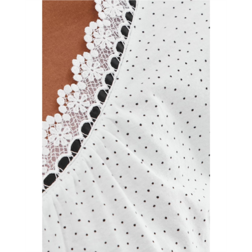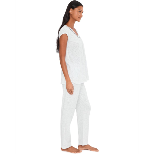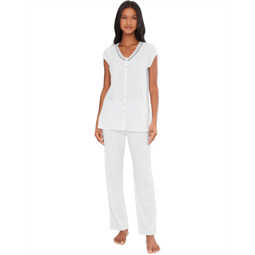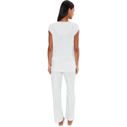 - Made from soft cotton jersey knit, this cap sleeve long pant set is as easy to wear as it is lovely to behold. A romantic V-neckline is framed with floral beaded Venise lace, delicately beaded with satin ribbon for a soft, luminous touch. Cap sleeves are softly shirred at the shoulder, adding a romantic flutter, while gentle gathers along the neckline create a relaxed, graceful drape. A trail of delicate flower-shaped Akoya shell buttons lends a sweet, vintage feel. Paired with a full-length pant featuring in-seam pockets and a soft drawcord waist, this set is a perfect blend of comfort and timeless charm.