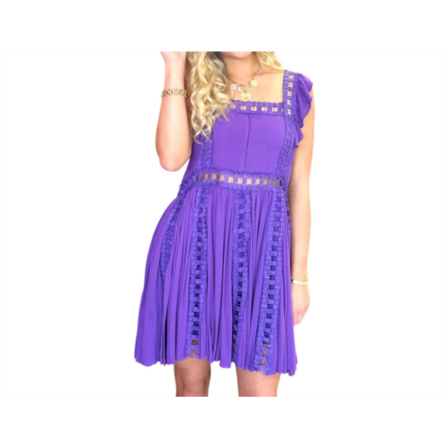 A short and breezy dress for those warmer days.Introducing the Adams Mini Dress by BUDDYLOVE, a boho chic masterpiece in a vibrant purple hue. This sleeveless A-line silhouette features smocked side panels, flutter detailing, and intricate crochet textures that bring a unique flair to your ensemble. Ideal for summer engagements, it effortlessly pairs with boots, sneakers, or wedges to suit your style needs. Neckline - Squareneck.