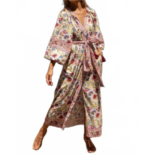 Style this maxi with your favorite statement necklace and sandals for the perfect look.Introducing the Adriana Long Dress by Miss June Paris, a multi-color patterned piece perfect for a vacation-ready style. With its long puff sleeves and A-line silhouette, this dress combines retro charm with modern flair. The design features a sophisticated tie belt that accentuates the waist, enhancing its boho chic appeal. Closure - Button closure. Care - Machine wash, tumble dry, making it an easy-to-maintain choice for any Thanksgiving or spring occasion.