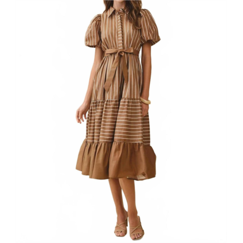 The perfect length dress does exist.Introducing the Blair Midi Dress by TCEC, a captivating piece in a chic mocha stripe pattern. This dress showcases short puff sleeves and an elegant collared neckline alongside a button closure for a polished look. Designed with a tiered A-line silhouette and a removable self-tie waist belt, it effortlessly combines elegance and versatility. Ideal for a dinner party, this piece exudes Boho Chic charm, perfectly suited for spring occasions. Model details - 5'11' height, 31.5' bust, 23.5' waist, 35' hips; wearing size small.