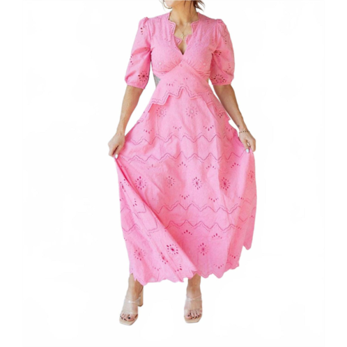 Style this maxi with your favorite statement necklace and sandals for the perfect look.Step into spring with the Victoria Eyelet Maxi Dress by Fore Collection, a perfect option for evening events or special occasions. This maxi dress features short sleeves, a flattering A-line silhouette, and a v-neck neckline in a vibrant barbie pink color. Crafted from 100% solid cotton, it includes a zip closure and is recommended to be hand washed and line dried for optimal care. This dress combines the trend of quiet luxury with a romantic touch, making it an ideal choice for Valentine's Day.
