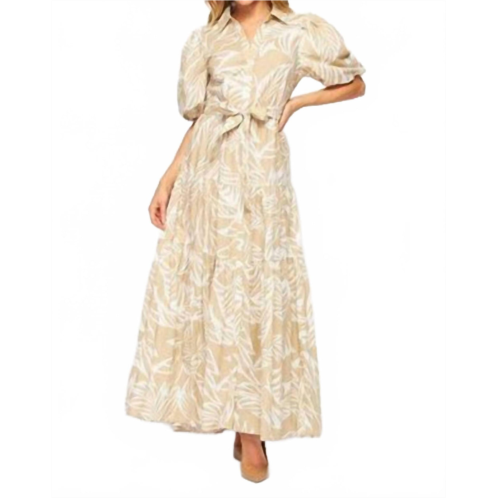 [US] BIG HIT FASHION woven palm print bubble sleeve maxi dress in taupe