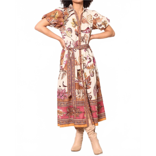 A maxi dress that is just as cute as it is comfortable.Elevate your spring wardrobe with the Della Maxi Dress by Maude Vivante, a stunning piece in Olive Trails. Featuring short puff sleeves and crafted from 100% cotton, this dress offers breathable comfort alongside a stylish button-front design. It includes a classic collar and a matching belt for versatile styling, making it perfect for holiday parties or a Thanksgiving gathering. Closure - Button closure. Care - Machine wash and line dry.