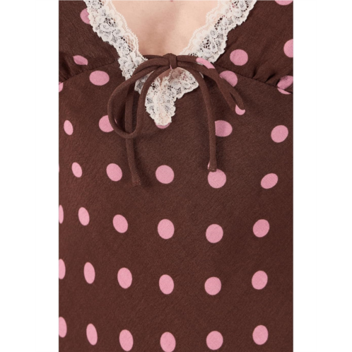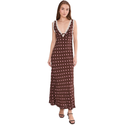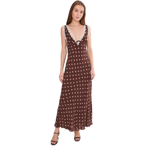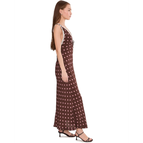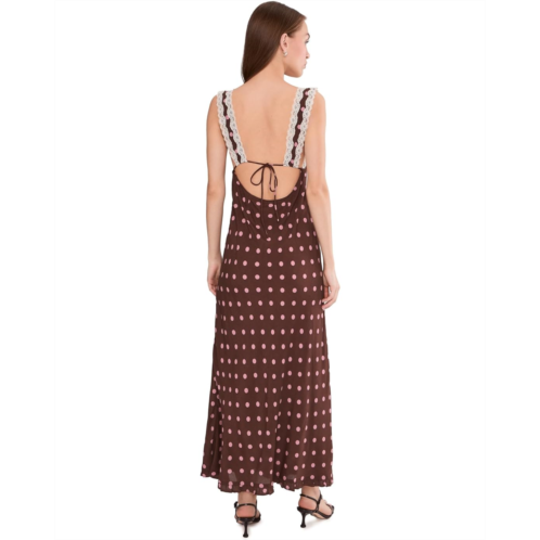 - The L*Space Eyes On You Maxi dress is feminine, flirty, and full of main character energy. This sleeveless dress is designed with a plunging V-neckline, a lace trim, and an open back. Made from viscose, it features an allover polka-dot print. Style this printed maxi dress with a pair of kitten heels for date night or drinks with the girls.