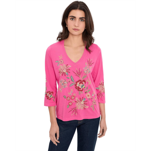 - Make your way into the fashion game wearing the Johnny Was 3/4 Sleeve Trapunto V-Neck Tee. Soft floral print drifts across this rosy top like petals caught in a warm breeze, adding a touch of romance to its easy three-fourth sleeve silhouette. Feminine and feel-good, the pull-on style top is made to brighten days and linger sweetly into evening.