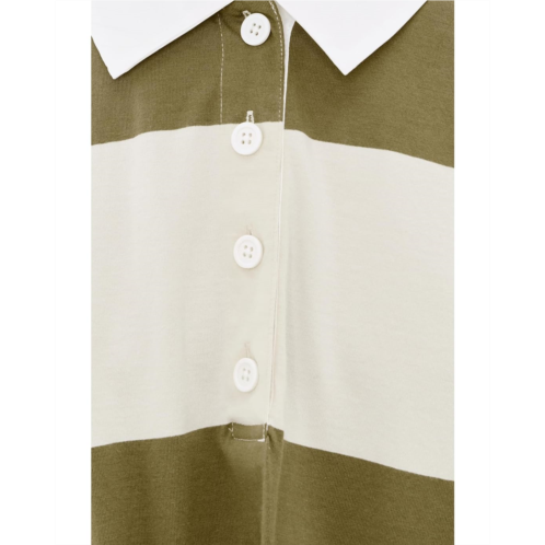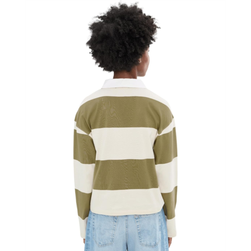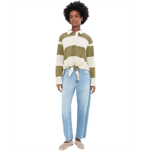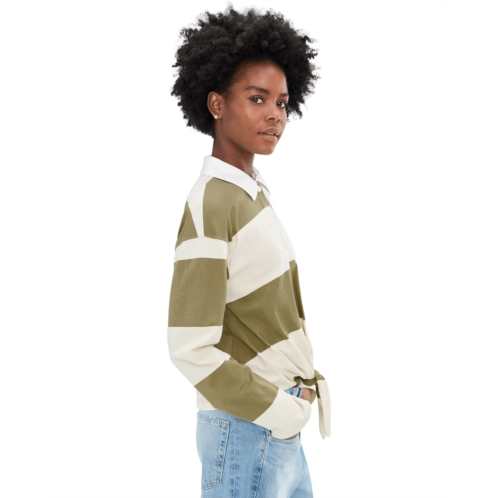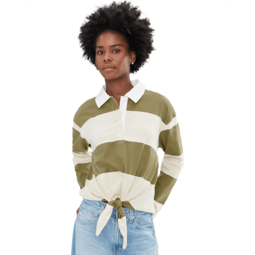- The Sanctuary Rugby Tie Front Tee is a versatile wardrobe essential featuring a relaxed silhouette and cozy texture. Perfect for pairing with denim, skirts, or tailored trousers. This top features collared neckline with four-button placket, long sleeves, front tie detailing hem, and striped print.