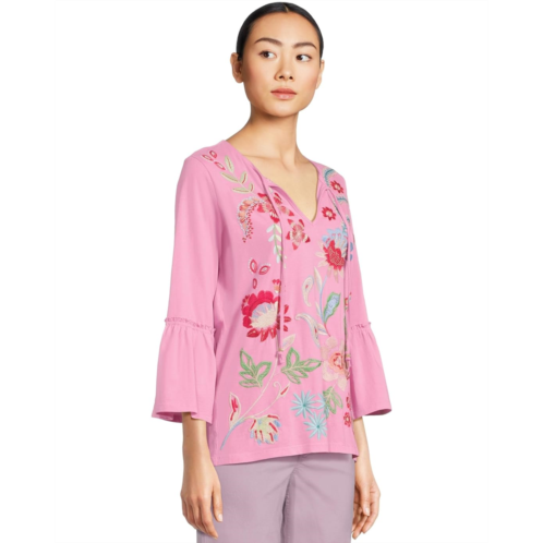 - Crafted for style and breathable comfort, the Johnny Was Ruffle Sleeve T-shirt is the perfect addition to your casual wardrobe. The pull-on style tee features a V-neckline with tie-up detail, three-fourth ruffle sleeves, a straight hem, and a vibrant embroidery allover for added splash of color.
