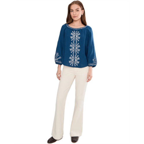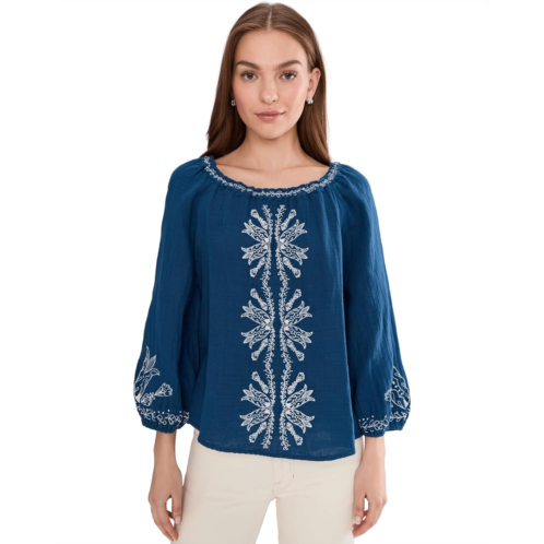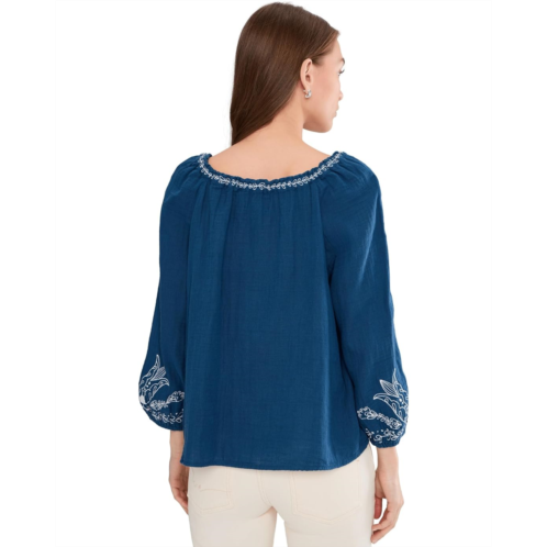 - The Liverpool Los Angeles 3/4 Sleeve Woven Top With Embroidery blends relaxed elegance with thoughtful detail for a look that feels both polished and easy. Designed with a flattering high shoulder point and a gently shaped scoop neckline with elastic, it offers comfort without compromising style. Intricate embroidered detailing adds quiet character, elevating this woven silhouette with artisanal charm. The 3/4 sleeves feature elasticized hems for a subtle blouson effect, creating soft structure and all-day ease. A convenient pull-on design makes it perfect for busy mornings while still delivering a refined finish. Lightweight and breathable, this top transitions effortlessly from desk to dinner.