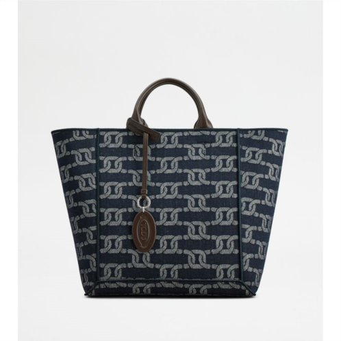Shopping bag in denim with jacquard chain pattern and calfskin leather. Featuring two tubular handles, secured with maxi T-stitching, it comes with two long flat handles, for a versatile use. Enriched by the oval pendant with stamped Tod's logo, it is complemented by a removable internal pouch.