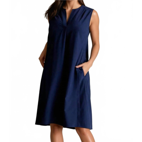 A midi dress so versatile, your options for wearing it are endless.Meet the A-liner Dress by Buki, a sleek and ultra-comfortable choice for any occasion. This sleeveless, v-neck shift dress is expertly crafted from 88% Polyester and 12% Spandex, making it feather-light and ideal for a chic yet relaxed look. As functional as it is stylish, the dress features convenient side pockets and a solid navy hue that adds to its minimalist appeal. Effortlessly adaptable with a pull-on closure, this wrinkle-resistant dress is machine washable, offering easy care for the modern woman on the go.