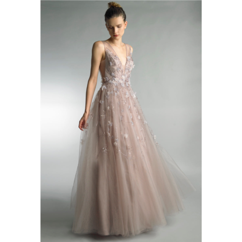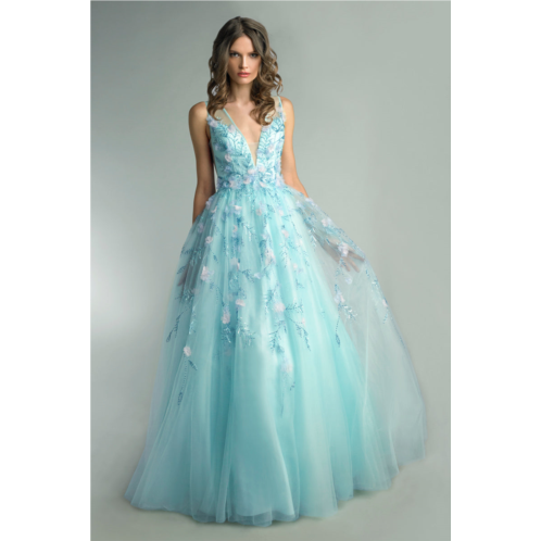 Beaded v neck sleeveless a line gown with 3d floral applique