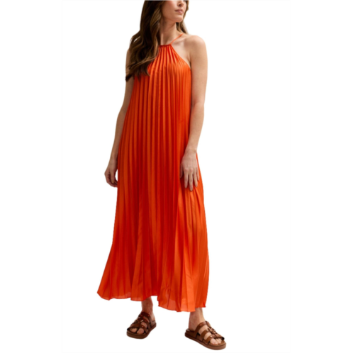 The Philomena maxi dress in orange is a floor-length masterpiece featuring a flattering halter neck design that beautifully frames the shoulders. The delicate pleats create fluid movement, enhancing the dress’s luxurious feel.