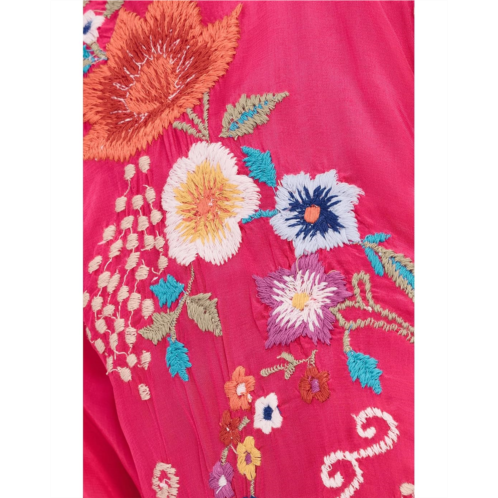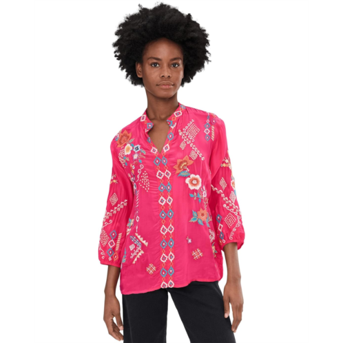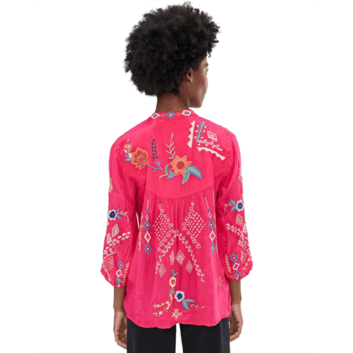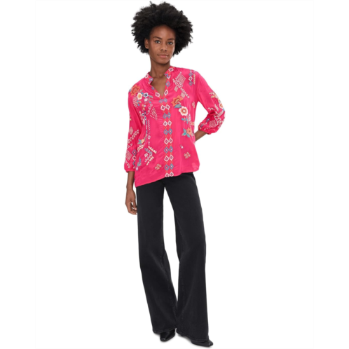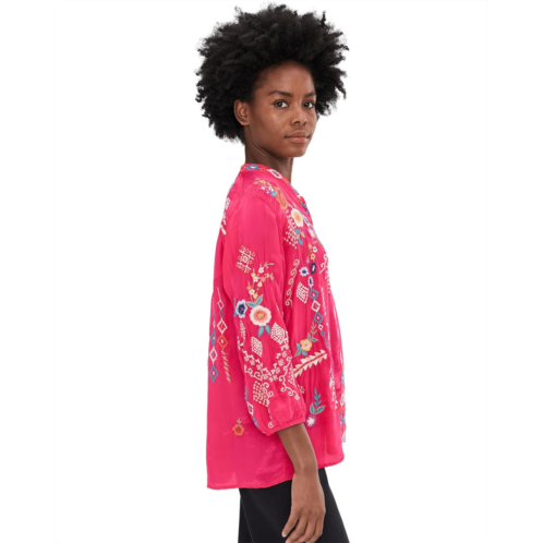 - Allure in every thread wearing Karyn Seo Bria Blouse, handcrafted with cupra rayon and embellished with colorful embroidery allover. The pull-on style top features a V-neck, three-fourth puff sleeves, and a curved hem.
