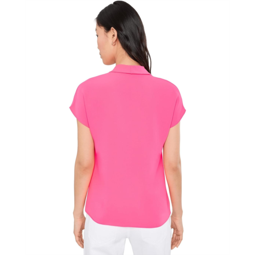 - The Trina Turk Turin Top has a relaxed fit with a front overlay that drapes in the center. It is designed with a V-neckline, short sleeves, and asymmetrical hem.