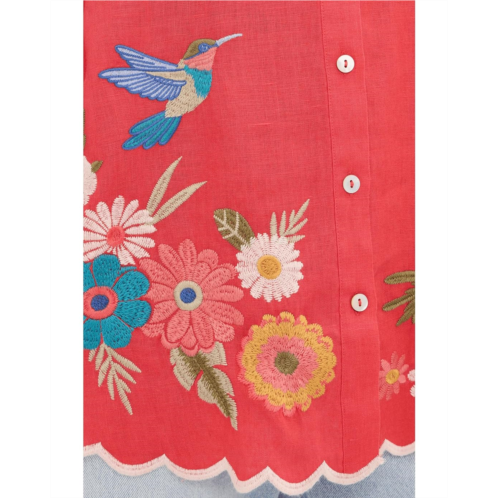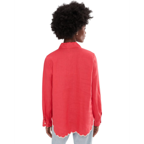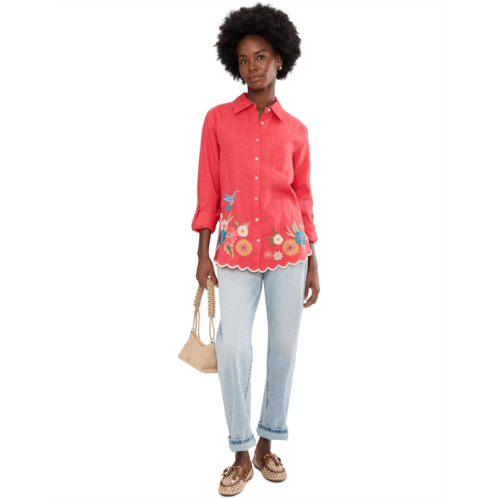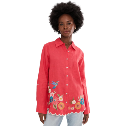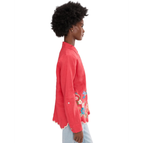 - Slay the style game wearing Johnny Was Relaxed Linen Shirt - Francis. This vibrant top features delicate floral embroidery along the scalloped hem for a soft, feminine finish. The collared neck, full button-front closure, and long sleeves with button closure add a structured look, while the patch pocket at the left chest adds to the functionality. Lightweight and easy to wear, it brings effortless charm to denim and beyond.