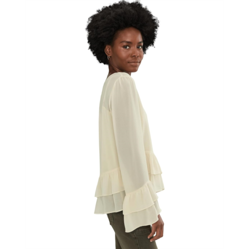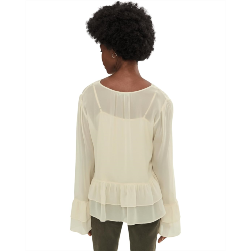 - The Sanctuary There She Goes Blouse is a lightweight and chic blouse that features ruffle detail at the sleeves and hem. Made from viscose Georgette, it offers a perfect blend of comfort and breathability. The buttoned front closure ensures easy wear. This stylish top is designed with long sleeves, a V-neckline, and a ruffle hem.