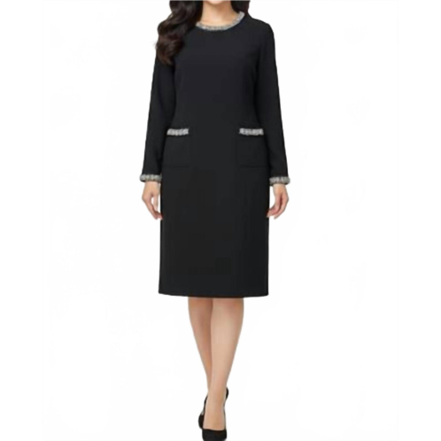 Just add slides or mules and you are good to go.Elevate your wardrobe with the Elegant Midi Dress by Kathie K, designed for sophisticated workwear and dinner parties. This solid black, shift silhouette dress features long sleeves and a classic crewneck. It includes a convenient zip closure and handy pockets, making it both stylish and functional. Perfect for fall and New Year's Eve occasions.
