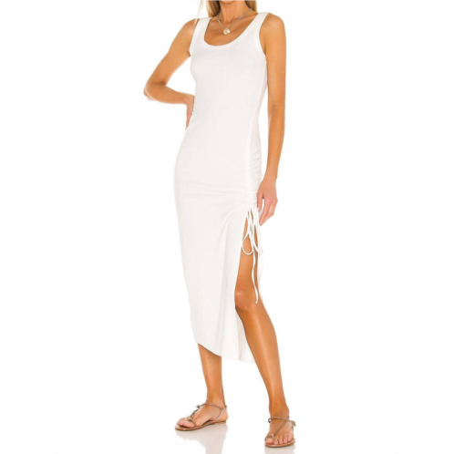 Just add slides or mules and you are good to go.Introducing the Sandpiper Dress by L*SPACE, a chic and sophisticated choice for the modern woman. This sleeveless, bodycon midi dress in cream exudes elegance with its solid pattern and scoop neckline. Crafted from a blend of 90% tencel and 10% spandex, it features a stylish ruched side with tie fastening and ribbed fabric. With a shoulder seam to hem measuring approximately 57 inches, this dress is designed for effortless pull-on styling. Easy to care for with hand washing recommended.