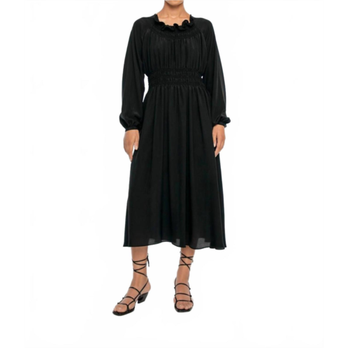 A midi dress so versatile, your options for wearing it are endless.Embrace elegance with the Signature Shirred Midi Dress by Dl the Label, a refined piece in classic black. This silk dress features long puffed sleeves and a sophisticated high ruffled neckline, complemented by shirred detailing and smocking at the waist, ending in a fluted hemline. Crafted with meticulous in-house techniques, it promises both style and quality. Closure - Button closure. Care - Dry clean only. Perfect for evening events or Thanksgiving celebrations.