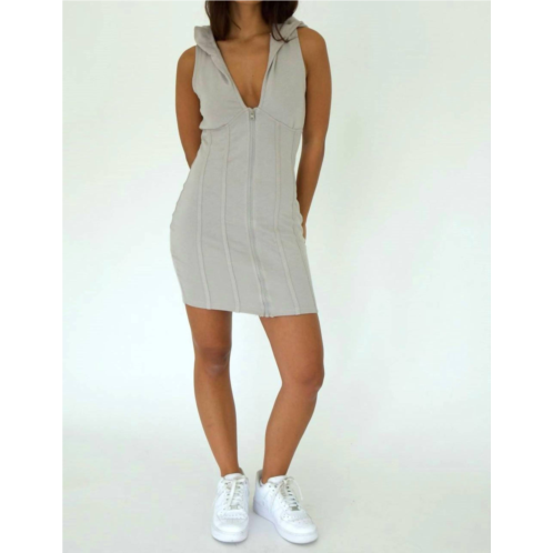The perfect mini dress for those warmer months.Introducing the Silvie Athletic Mini Dress by ANWND, a sporty and stylish piece in light gray for the modern woman's wardrobe. This sleeveless, hooded dress features a bodycon silhouette crafted from a breathable French Terry Cotton Blend (60% Cotton, 40% Polyester) with a textured pattern. It is designed with a convenient zip closure and detailed front and back seaming for an enhanced fit. Perfect for a fitness or workout occasion, this athleisure staple can be paired with a bomber jacket and sneakers for a trendy look. Model is 5'6' and wearing a size small.