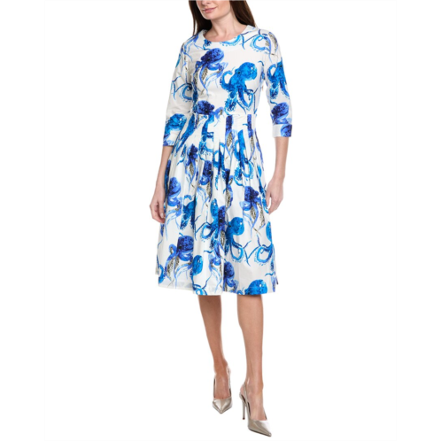 - Florance A-Line Dress In White Blue With 3/4-Length Sleeves, Button Cuffs, Pleated Skirt, Dual Side On-Seam Pockets, Self-Tie Sash At Waist, And Removable Belt