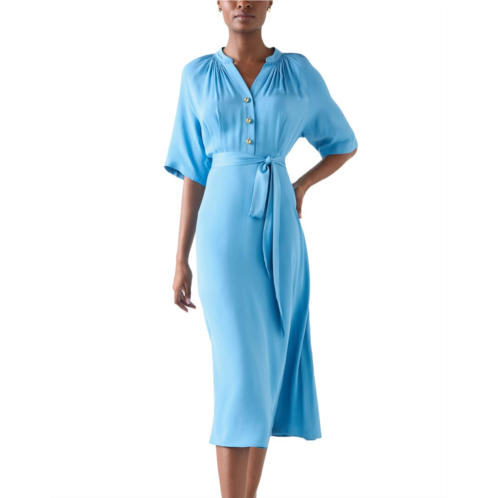 - Design Details - The Amber Dress Is A Blue Satin Midi Design Made From Sustainable Fsc Fabric. This Smart Casual Women's Clothing Piece Features A V-Neck, Short Sleeves And A Raglan Silhouette. The Self-Covered Tie Belt Defines The Waist, While Gold Metal Ball Buttons Add A Refined Touch. This Dress Combines Style With Sustainability. Pair With Strappy Heels And Statement Earrings For A Complete Woman's Outfit For Summer Events, Or Add A Tailored Blazer For Formal Occasions.