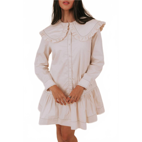 A short and breezy dress for those warmer days.Embrace minimalist elegance with the Ava Ruffled Collar Mini Shirt Dress by Aureum, a perfect choice for your next dinner party. This ivory dress features a distinctive oversized collar with a ruffled edge, adding a charming touch to its solid shirt silhouette. Crafted from 100% cotton, it offers long sleeves and a drop waist design, with contrast stitching enhancing its appeal. Closure - Button closure. Care - Hand wash and line dry.