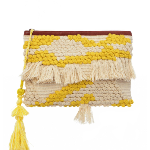 Lipstick, check. Mints, check. Credit card, check. The cutest little bag that holds all of your necessities.Meet the Majorca Clutch by Guadalupe Design, a striking accessory in vibrant Lime Yellow. Crafted from premium cotton canvas, this clutch boasts a fully lined interior and measures 9.3 inches in height by 13.3 inches in width. It features a secure zipper closure and convenient zip pockets, making it as practical as it is stylish. Handmade with care, it comes adorned with a charming tassel accent and intricate beading for a unique touch.