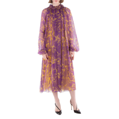 Burberry Ladies Dresses. Fashion category - Casual Dresses. SKU - 8077294. Color - Pear Ip Pattern. Burberry Rose Print Silk Dress. This Burberry Rose Print Silk Dress is an ethereal and flowy design crafted from lightweight silk. It features an all-over rose print in a striking contrast of deep purple and golden yellow tones. The dress has a high ruffled neckline, adding a romantic touch, while the voluminous silhouette drapes beautifully. The long sleeves are slightly sheer and finished with adjustable drawstrings at the cuffs, enhancing its delicate and feminine aesthetic. This statement piece embodies effortless elegance, perfect for special occasions. 100% silk. Made in Italy.