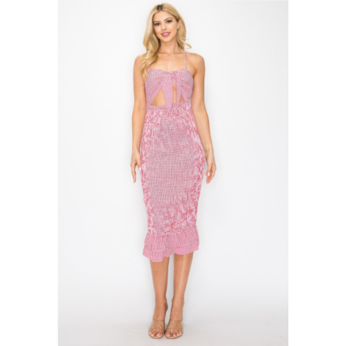 Feminine and effortlessly chic, this checker front knot smocked midi dress is the perfect blend of comfort and style. Crafted from a soft and stretchy polyester-spandex blend, it features a flattering smocked bodice that hugs your figure while allowing easy movement. The eye-catching checker print adds a trendy, modern vibe, and the front knot detail enhances the neckline with a touch of playful elegance. Designed in a midi length for versatile wear, this dress transitions beautifully from day to night with just a change of accessories.