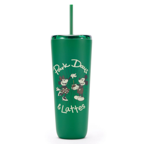 Whether you like your lattes hot or cold, this Mickey and Minnie Mouse Starbuckstumbler will go with you everywhere. Its stainless steel design features a matte hunter green finish decorated with Mickey and Minnie enjoying ''Park Days & Lattes.'' The green translucent lid features a sipper opening and a straw for handy on-the-go refreshment!