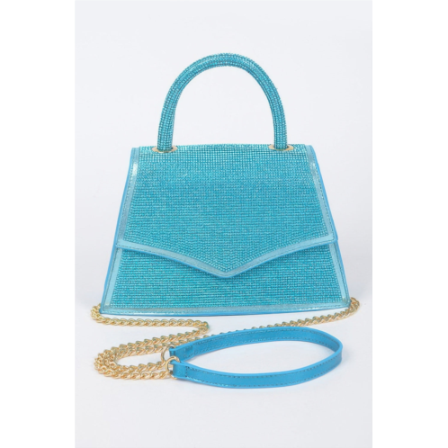 Make a striking entrance with the Rhinestone Top Handle Clutch, featuring a structured silhouette covered in radiant rhinestones. Compact yet spacious enough for essentials, it includes a sleek top handle and a softly structured body. Crafted from polyurethane with metallic accents, this clutch adds modern elegance to eveningwear. It is the perfect finishing piece for special occasions or nights out.