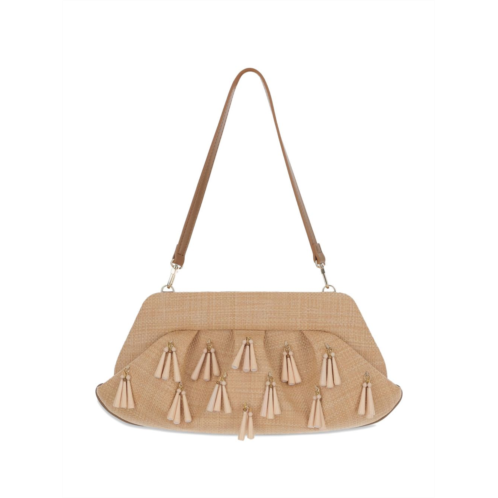sand beige magnetic fastening single detachable top handle bead embellishment main compartment Emera fringed clutch Width - 31cm, Height - 18cm, Depth - 7cm Size - UNI