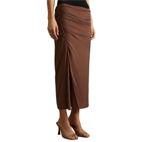 Introducing the Reiss Lisa Ruched Midi Skirt, a must-have addition to your wardrobe. This chic and stylish skirt features a ruched design in a rich chocolate color, perfect for any occasion. Made from a high-quality blend of 93% viscose and 7% elastane, this skirt is both comfortable and flattering. The skirt measures approximately 88.5cm from waist to hem and features a convenient zip closure at the center back. Pair it with your favorite blouse or sweater for a fashionable look. Designed by Reiss, a brand known for its design-forward style and focus on originality and quality. This skirt is dry clean only and imported for your convenience. Elevate your outfit with the Reiss Lisa Ruched Midi Skirt today!