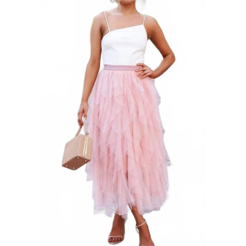 Show off just the right amount of skin in this beautifuly designed midi length skirt.Discover the elegant A-line Long Tulle Midi Skirts by ELINGS, crafted for women's fashion in a solid pink shade. Made from 100% polyester, this minimalist piece features a flattering A-line silhouette and ruffled design that complements its maxi length. The skirt's pull-on elastic closure ensures comfort and ease of wear, making it ideal for holiday parties, casual gatherings, and outdoor adventures during spring. Elevate your wardrobe with this stylish and versatile addition.