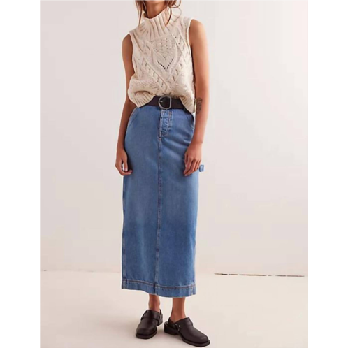 Tuck in your favorite tee for a more casual yet feminine look.Introducing the Francisco Denim Maxi Skirt by Free People, a timeless addition to your wardrobe that effortlessly transitions from season to season. Designed with a high-rise, true column fit, it features a button fly closure, practical four-pocket design, and shadow patch detailing. Material - Cotton with a textured pattern. Care - Machine wash cold. Crafted with thoughtful details like a back vented hem and a side hammer loop, this piece offers endless styling opportunities.