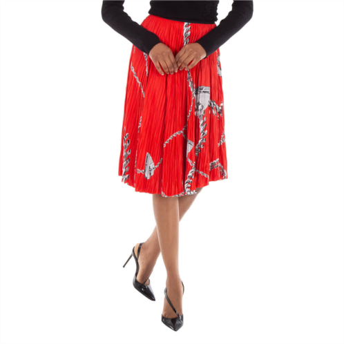 Burberry Ladies Bottoms. Fashion category - Skirts. SKU - 8089264. Color - Silver/Red. Burberry Shield Hardware Jersey Midi Skirt. This pleated skirt, made from heavyweight jersey, is printed with hand-painted artwork showcasing our jewelry and bag hardware. It features a subtle asymmetric hem, a contrasting grosgrain waistband, and a mid-length cut for a chic and contemporary look. 100% polyester. Made in Italy.